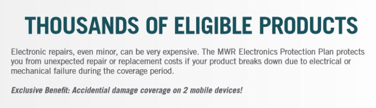 The MWR Electronics Protection Plan is the most comprehensive electronics coverage plan in the industry. Our protection plan covers ALL of the consumer electronics IN YOUR ENTIRE HOUSEHOLD such as TVs, computers, mobile phones, tablets, blenders, stereos, gaming consoles – basically anything in your home that plugs in or has batteries – over 40,000 qualifying items for one low monthly fee with no long-term contract.